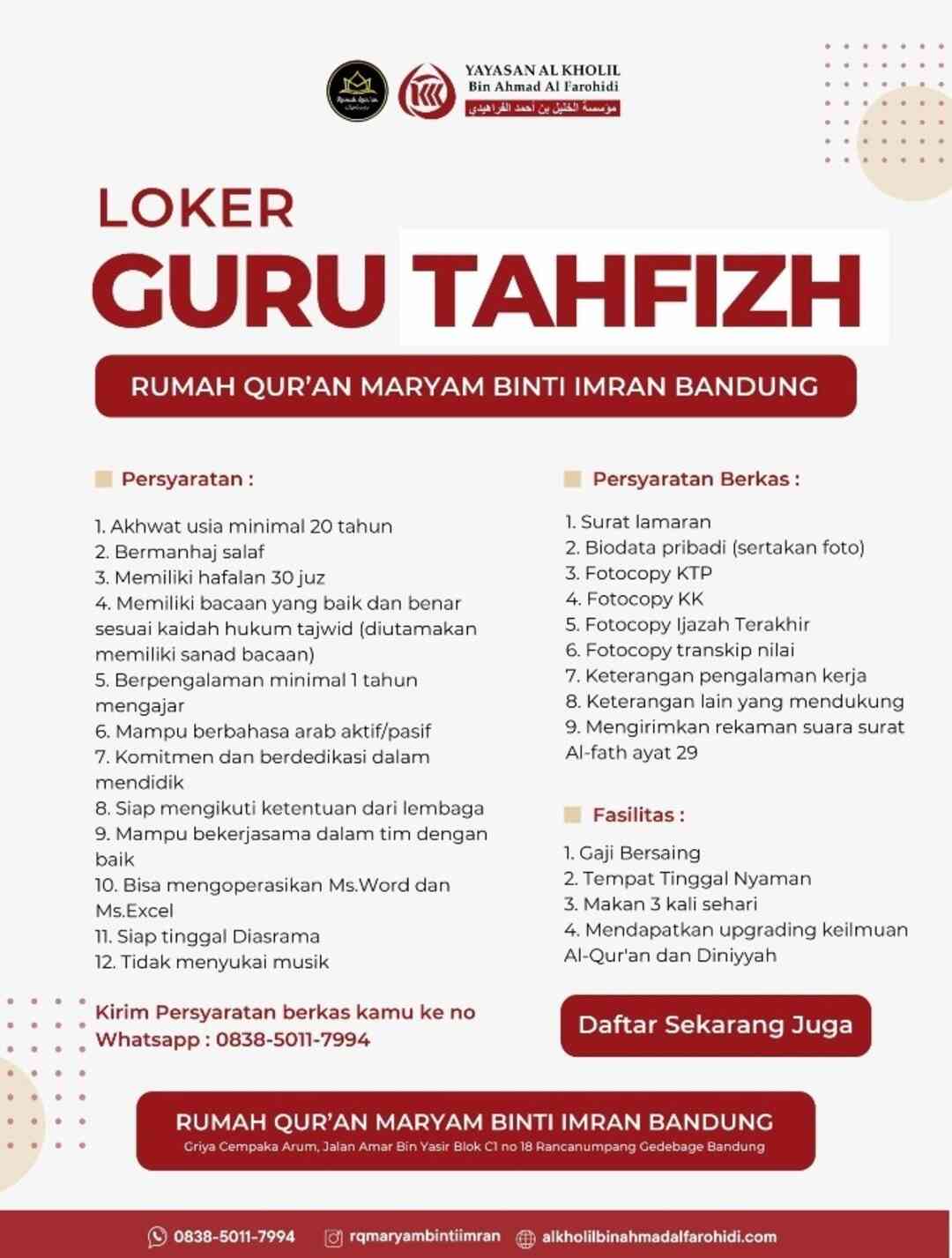[DIBUKA] Lowongan Kerja – Guru Tahfizh (Rumah Qur’an Maryam Binti Imran – Bandung)