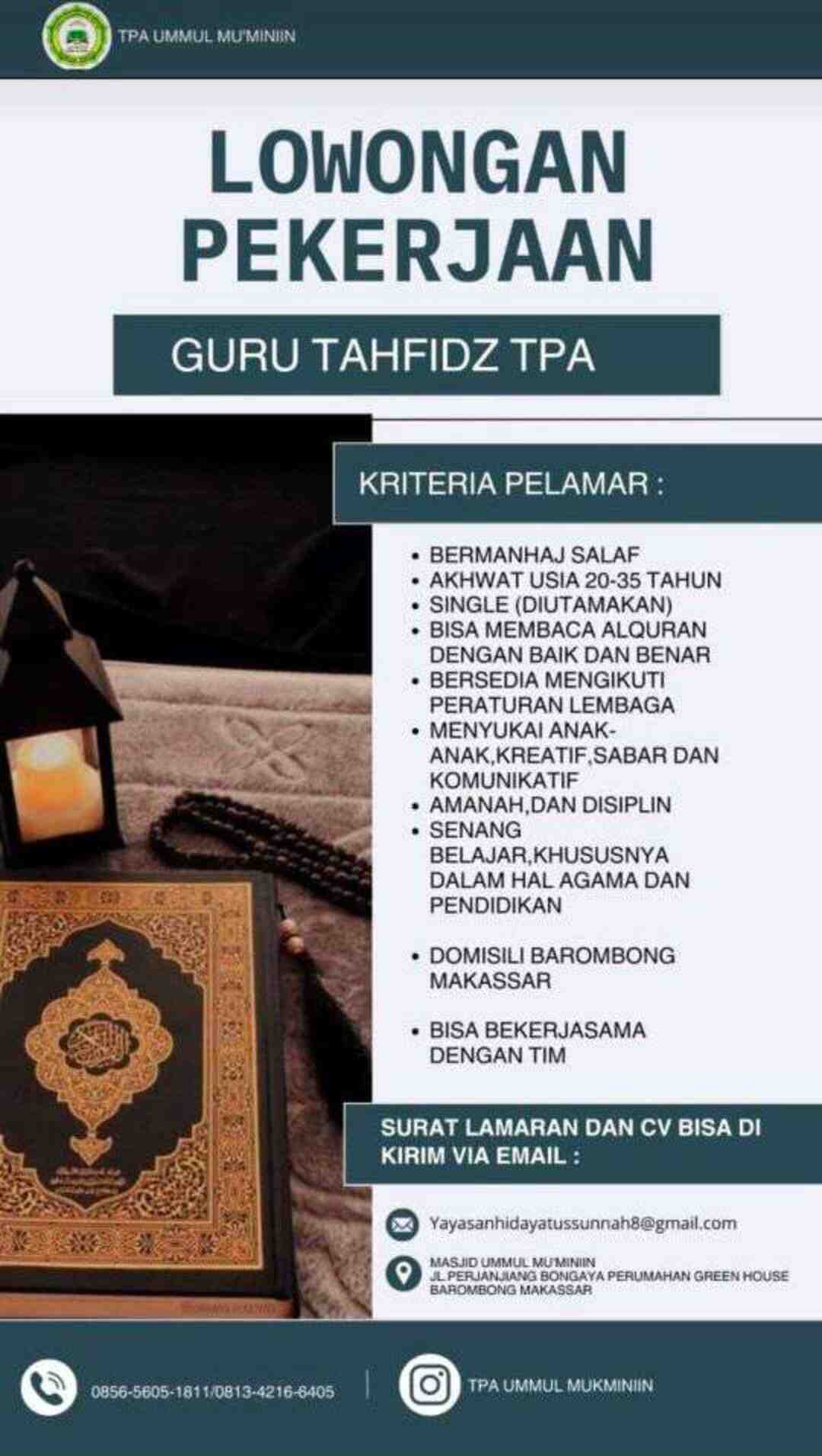 [DIBUKA] Lowongan Pekerjaan – Guru Tahfidz TPA (TPA Ummul Mu’minin – Makassar)