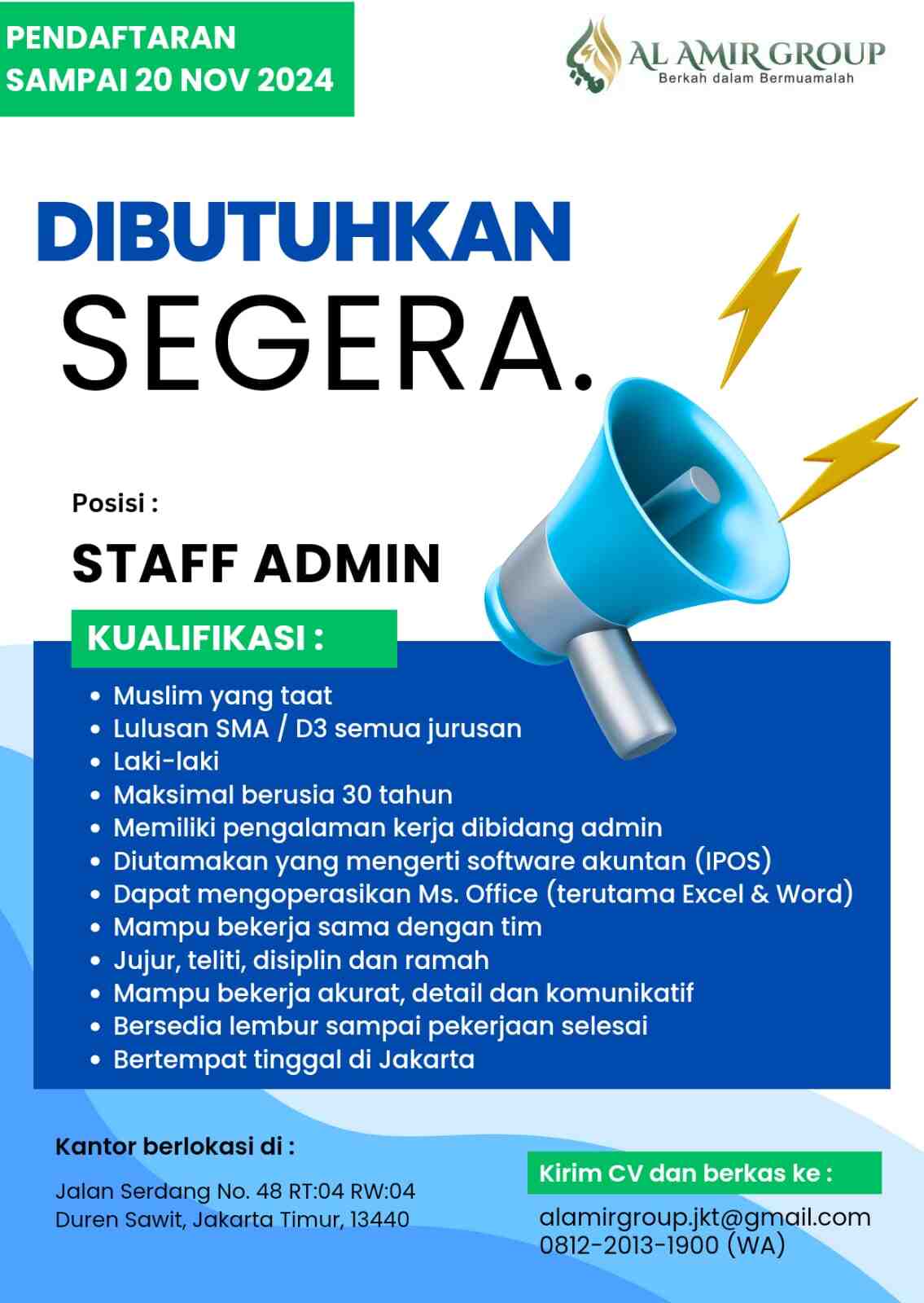 [DIBUTUHKAN SEGERA] Staff Admin (Al-Amir Group – Jakarta Timur)