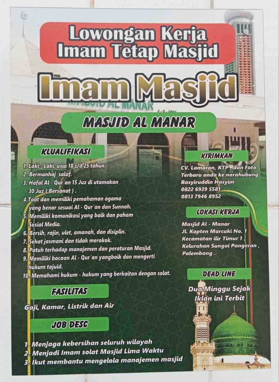 [DIBUKA] Lowongan Kerja – Imam Tetap Masjid (Masjid Al Manar – Palembang)