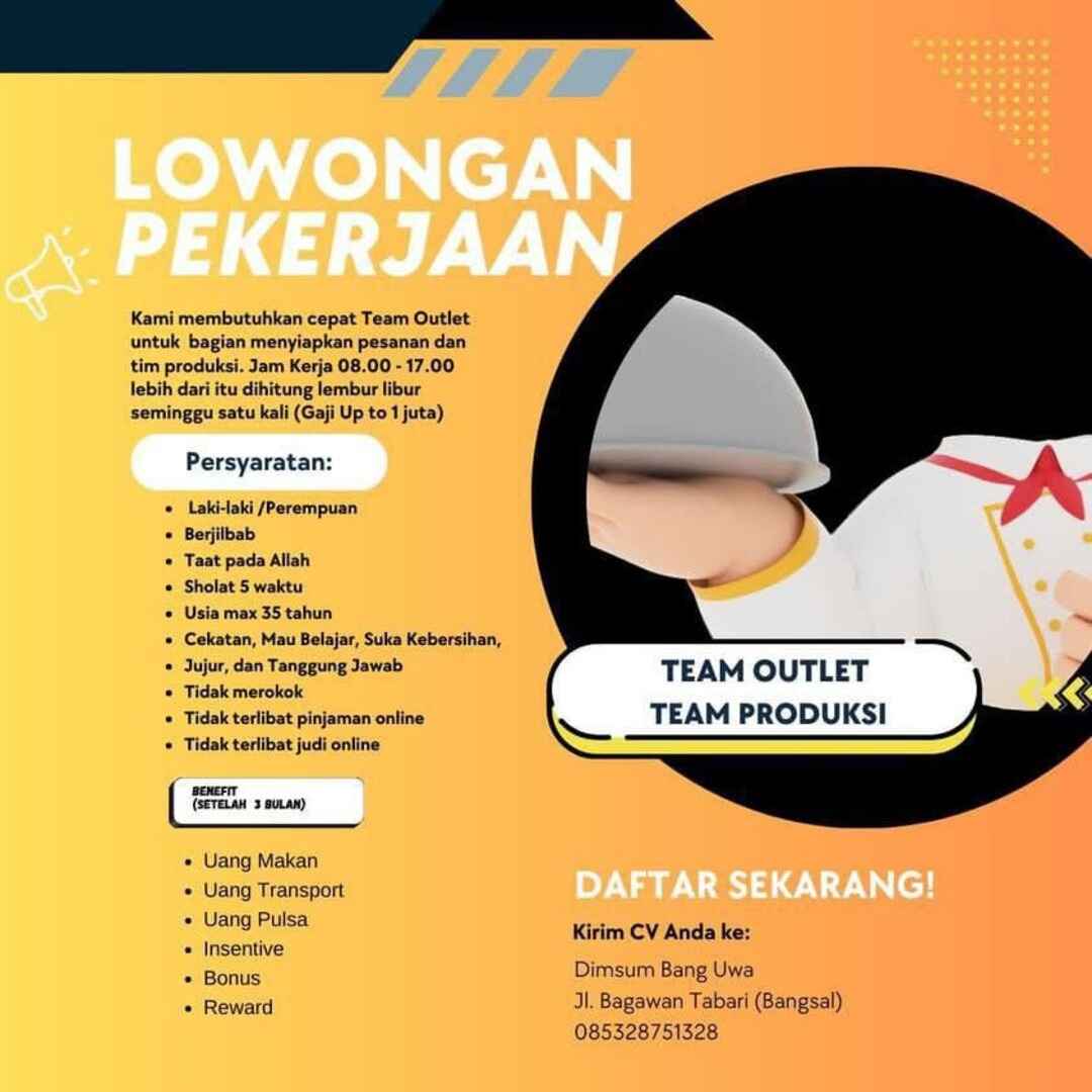 Kami membutuhkan cepat Team Outlet untuk bagian menyiapkan pesanan dan tim produksi. Jam Kerja 08.00 – 17.00 lebih dari itu dihitung lembur. Libur seminggu satu kali (Gaji Up to 1 juta)