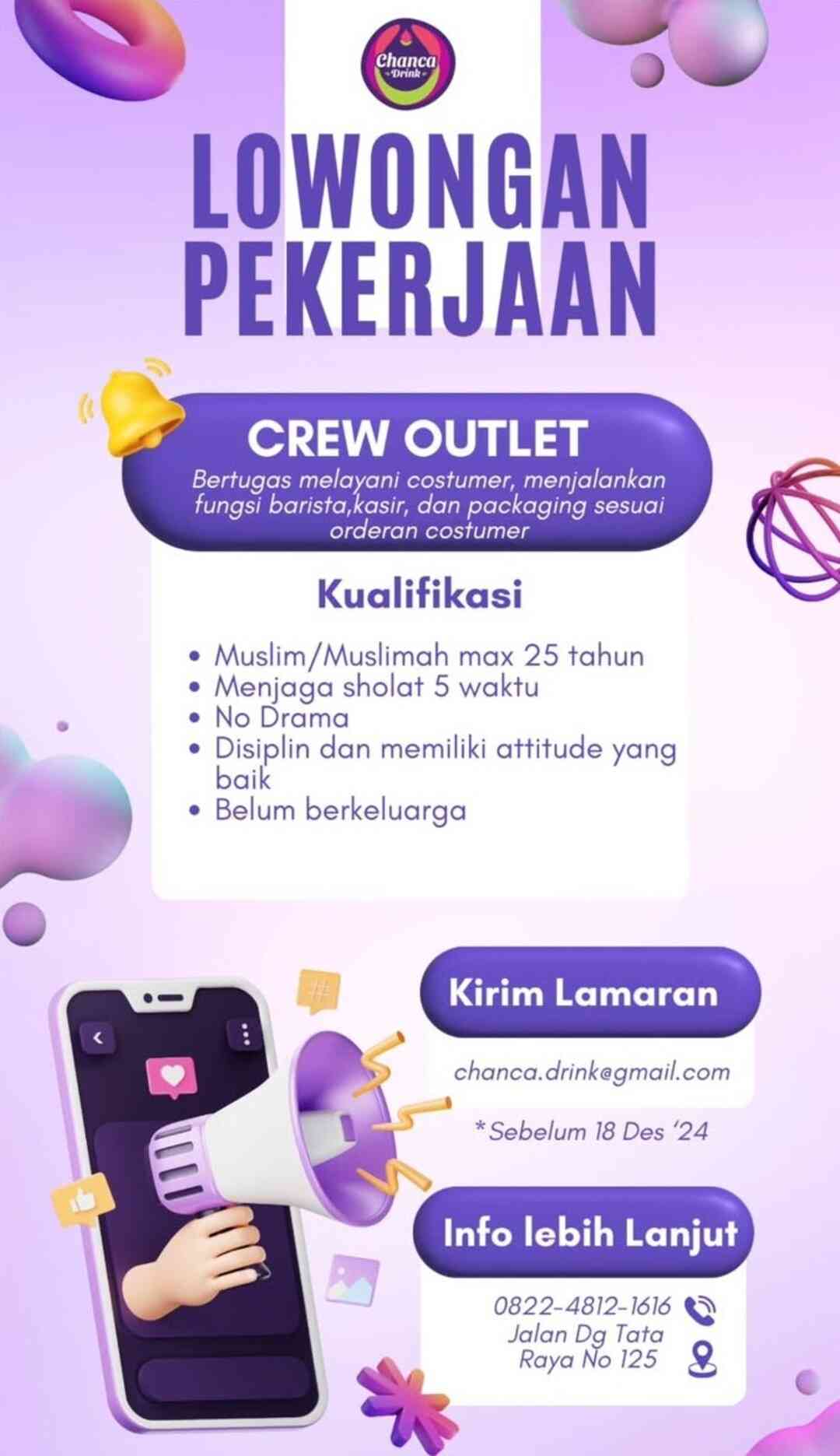 #loker #lowongankerja #carikerja #crewoutlet #lokercrew #lokerkru #lokeroutlet #lokercrewoutlet #lokerkruoutlet #lokerbarista #lokerkasir #ikhwan #lokerikhwan #akhwat #lokerakhwat #lowongankejamuslim #makassar #sulsel #lokermakassar #lokersulsel #YangPentingHalal #Halal #LokerHalal #LokerMuslim #lokermuslimid #lokermuslimah