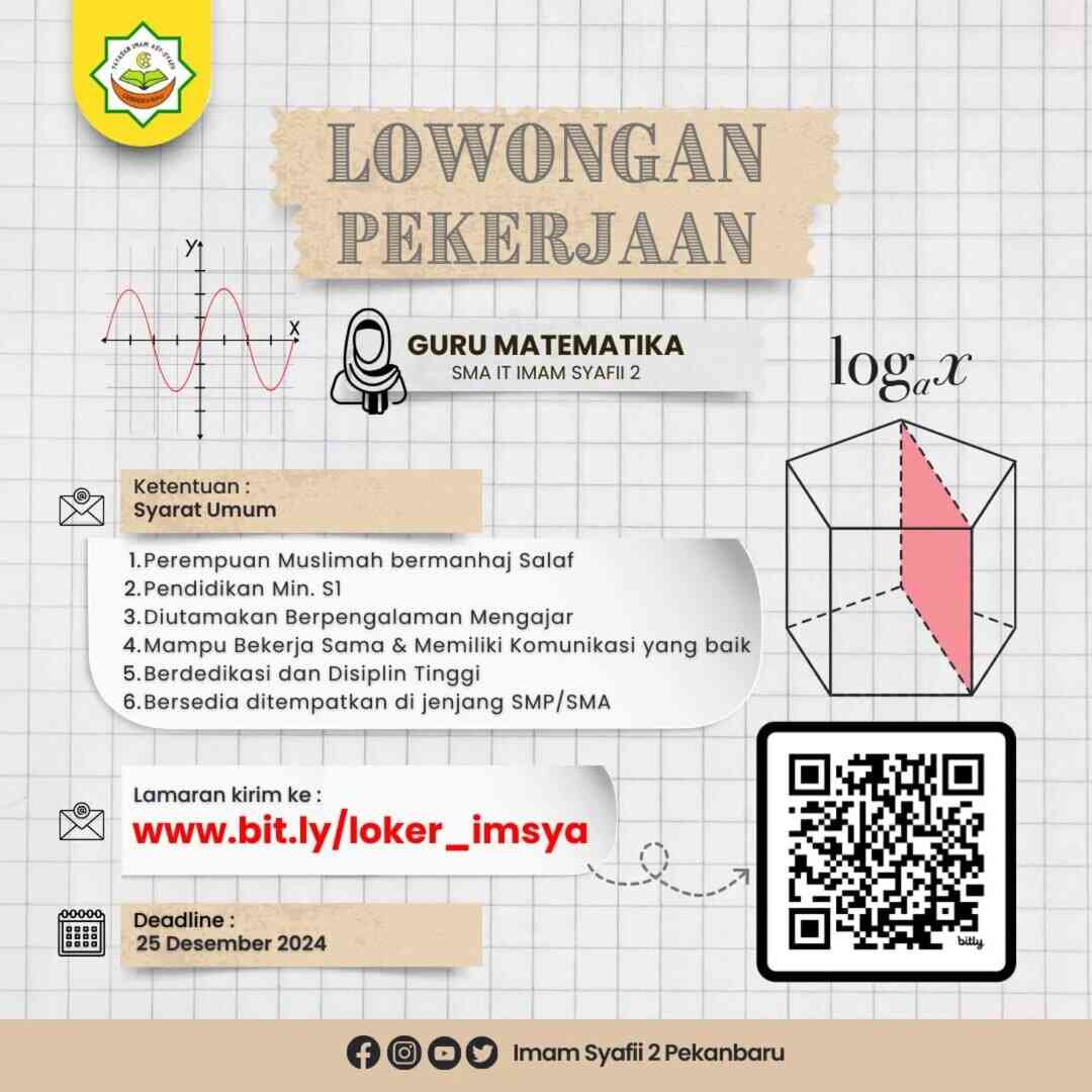 [DIBUKA] Lowongan Pekerjaan – Guru Matematika (SMA IT Imam Syafi’i 2 – Pekanbaru)