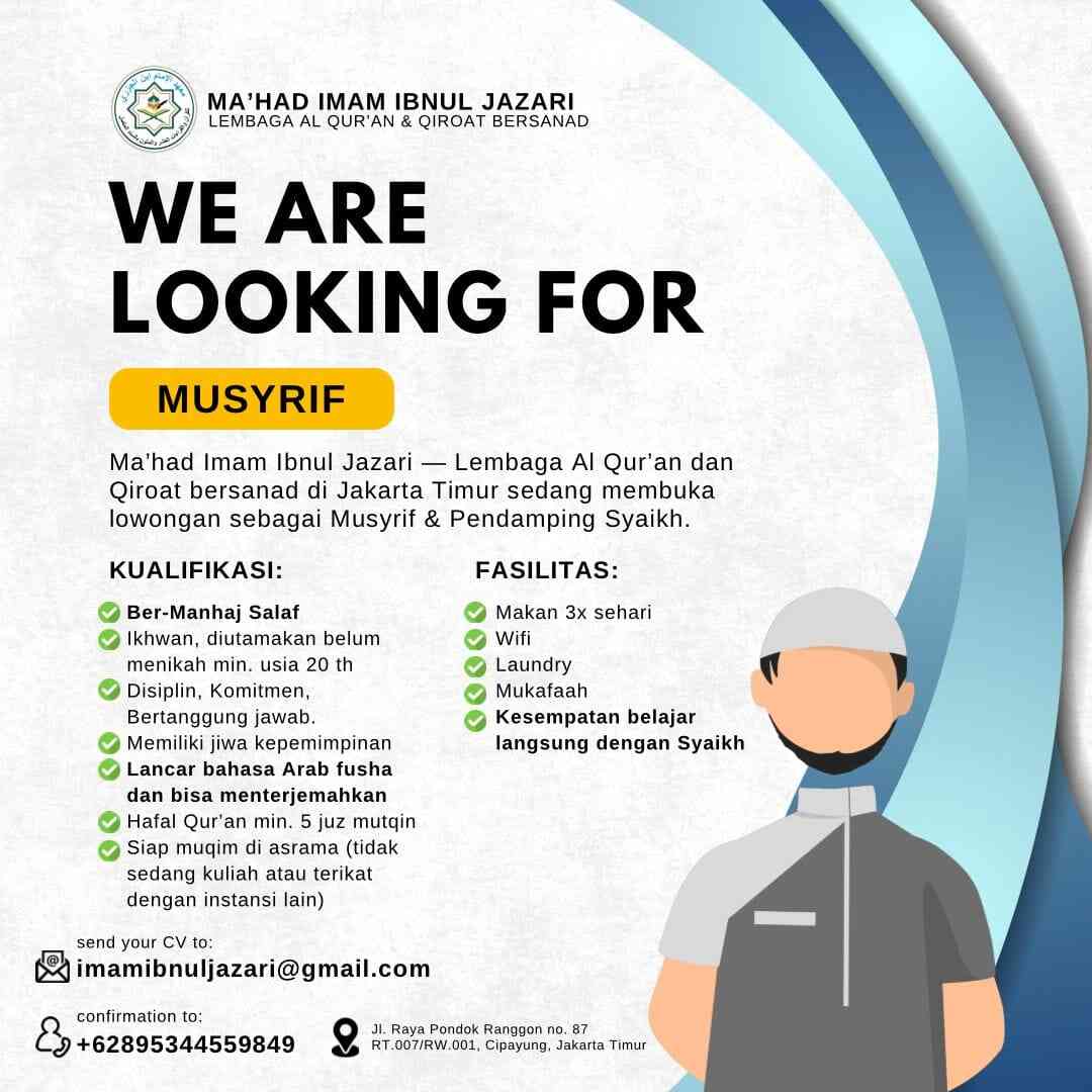 Ma’had Imam Ibnul Jazari – Lembaga Al Qur’an dan Qiroat bersanad di Jakarta Timur sedang membuka lowongan sebagai Musyrif & Pendamping Syaikh.