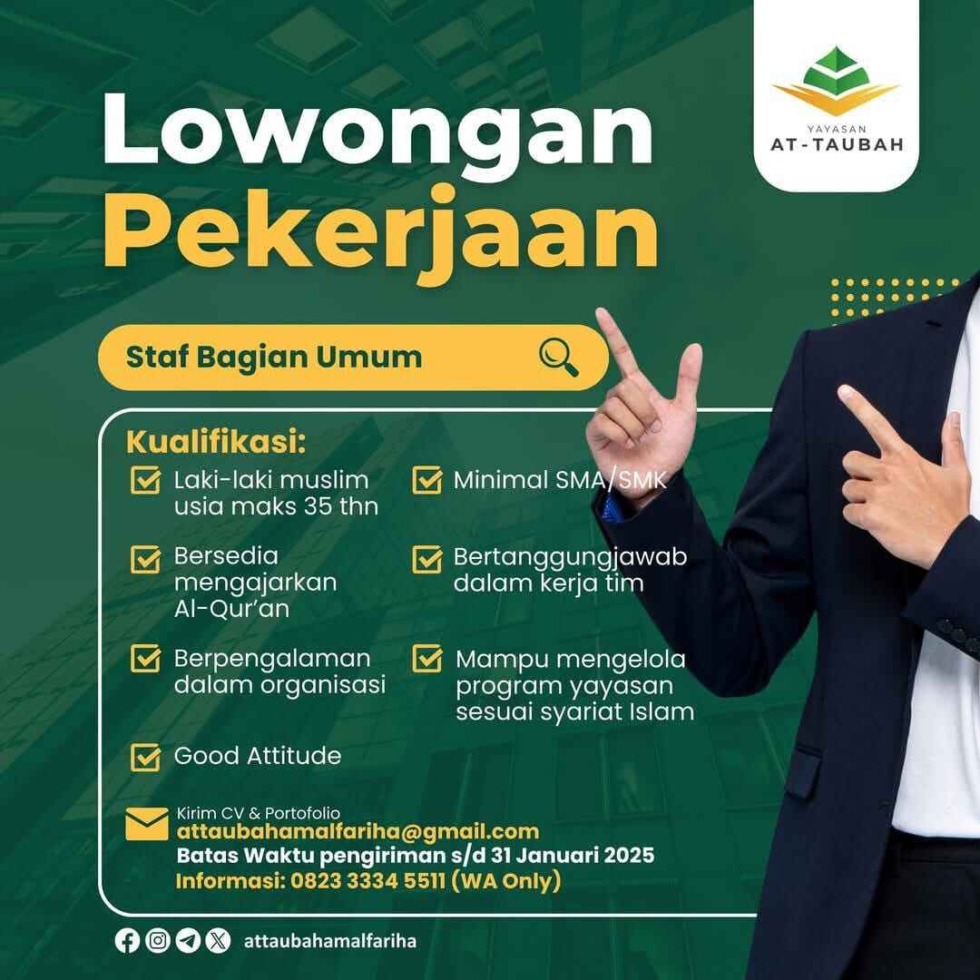 [DIBUKA] Lowongan Pekerjaan – Staf Bagian Umum (Yayasan At-Taubah – Surabaya)