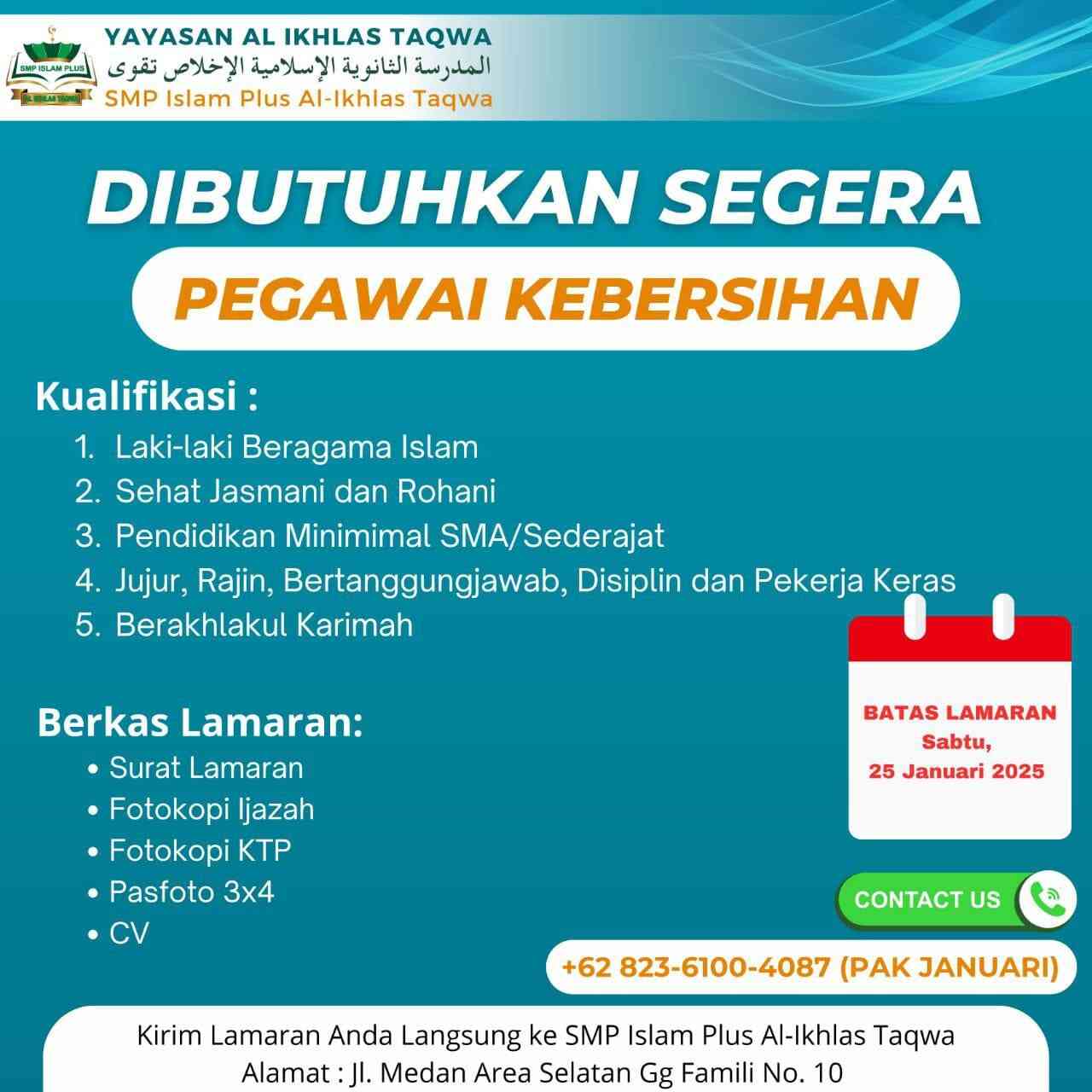 [DIBUTUHKAN SEGERA] Pegawai Kebersihan (SMP Islam Plus Al-Ikhlas Taqwa – Medan)