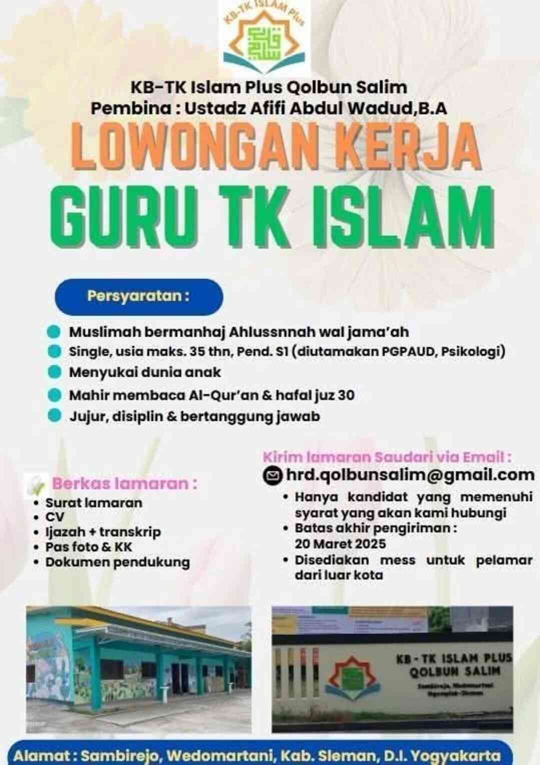 [DIBUKA] Lowongan Kerja – Guru TK Islam (KB-TK Islam Plus Qolbun Salim – Sleman)