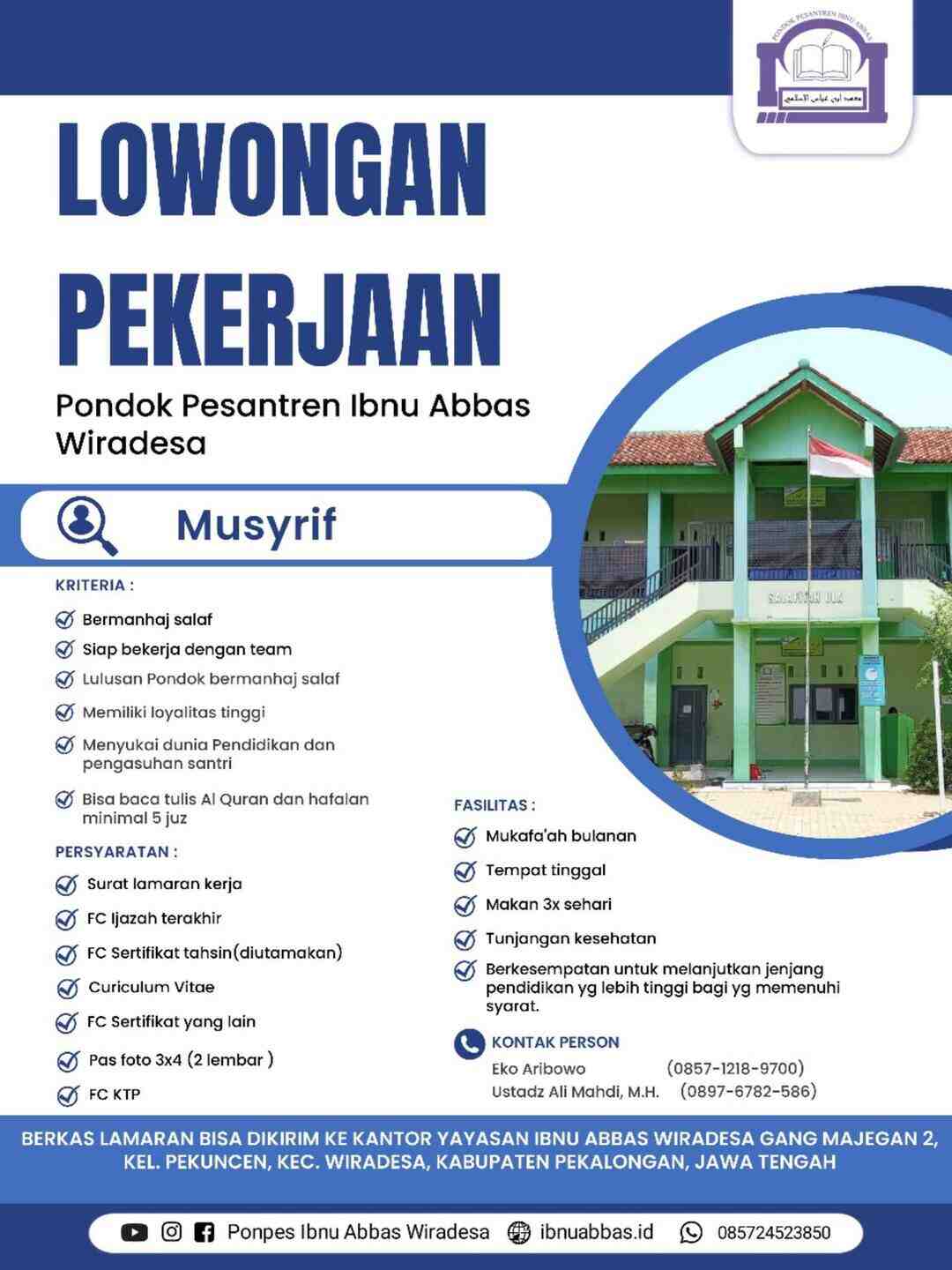 [DIBUKA] Lowongan Pekerjaan – Musyrif (Pondok Pesantren Ibnu Abbas Wiradesa – Kab. Pekalongan, Jawa Tengah)