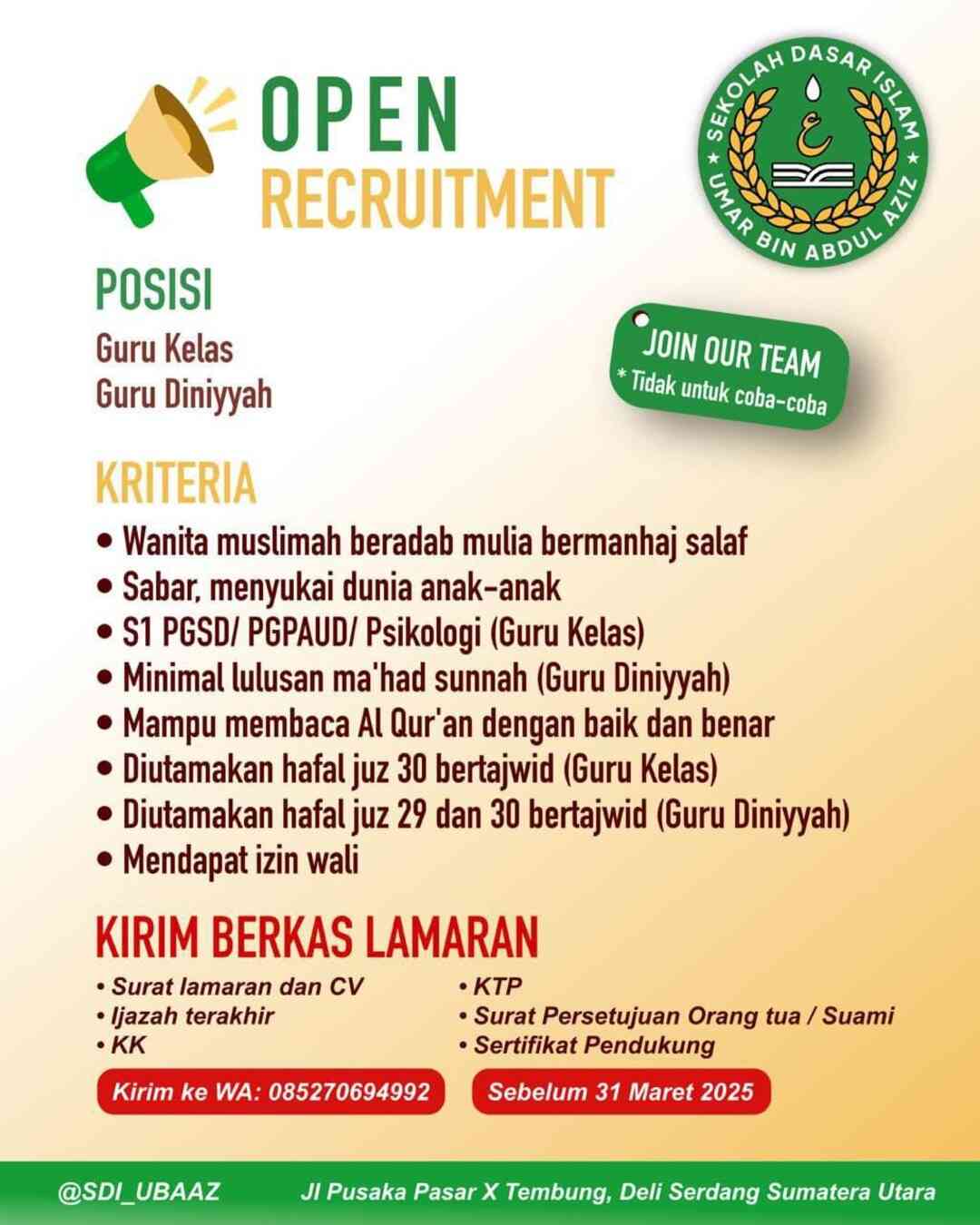 [DIBUKA] Lowongan Kerja Pada 2 Posisi (SDI Umar bin Abdul Aziz – Kab. Deli Serdang, Sumatera Utara)