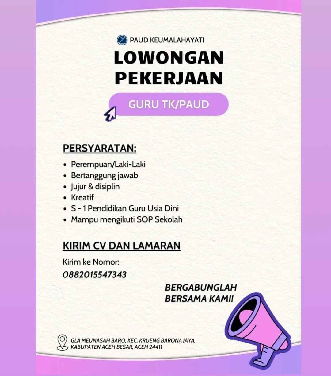 [DIBUKA] Lowongan Pekerjaan – Guru TK/PAUD (PAUD Keumalahayati – Kab. Aceh Besar)