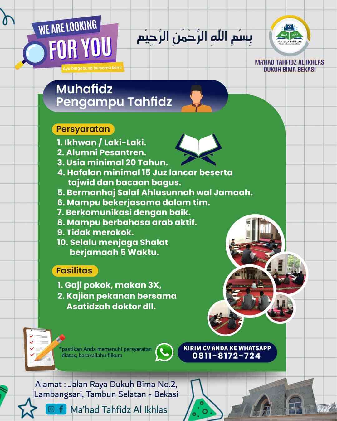 [DIBUTUHKAN] Muhafidz (Pengampu Tahfidz) (Ma’had Tahfidz Al Ikhlas Dukuh Bima – Bekasi)