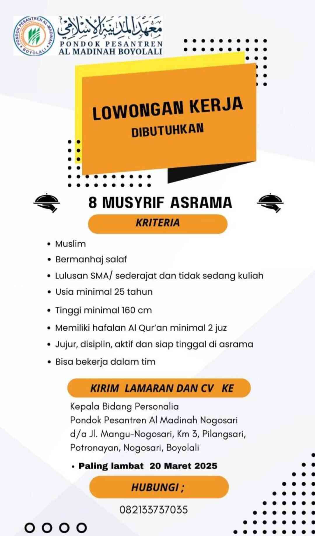 [LOWONGAN KERJA] Dibutuhkan 8 Musyrif Asrama (Pondok Pesantren Al Madinah – Kab. Boyolali)