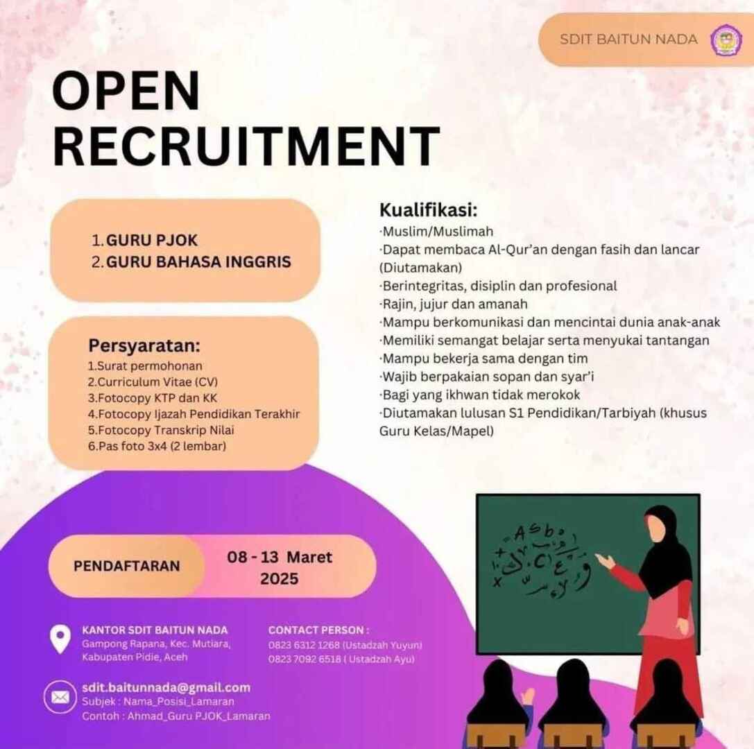 [OPEN RECRUITMENT] Lowongan Kerja Pada 2 Posisi (SDIT Baitun Nada – Kab. Pidie, Aceh)