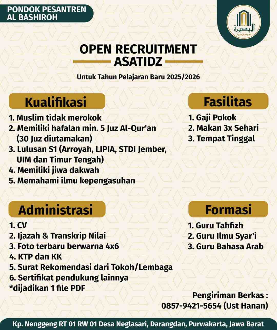 [OPEN RECRUITMENT] Pada 3 Formasi Pekerjaan (Pondok Pesantren Al Bashiroh – Purwakarta)