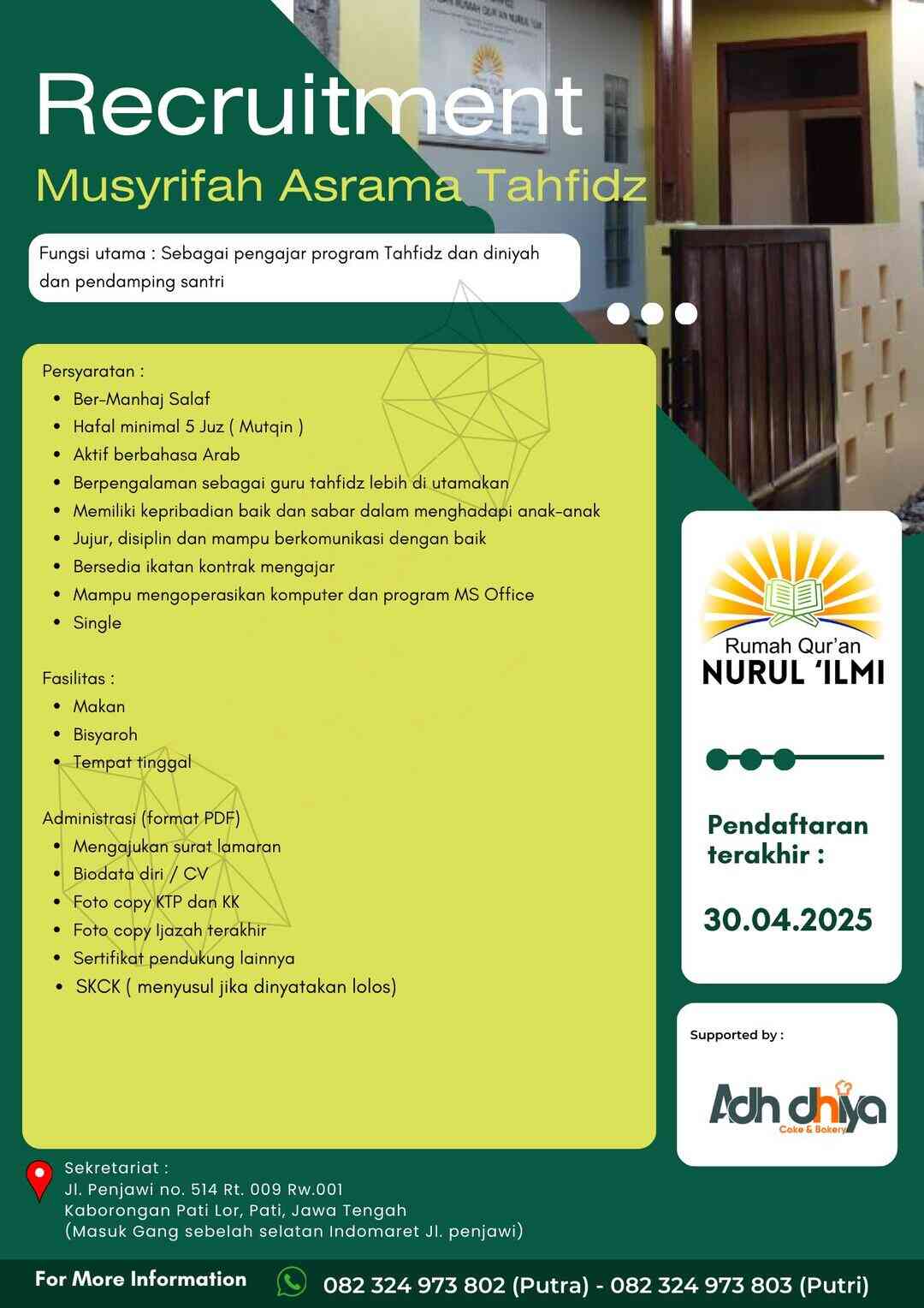 [DIBUTUHKAN] Lowongan Kerja Musyrifah (Rumah Qur’an Nurul ‘Ilmi – Kabupaten Pati)