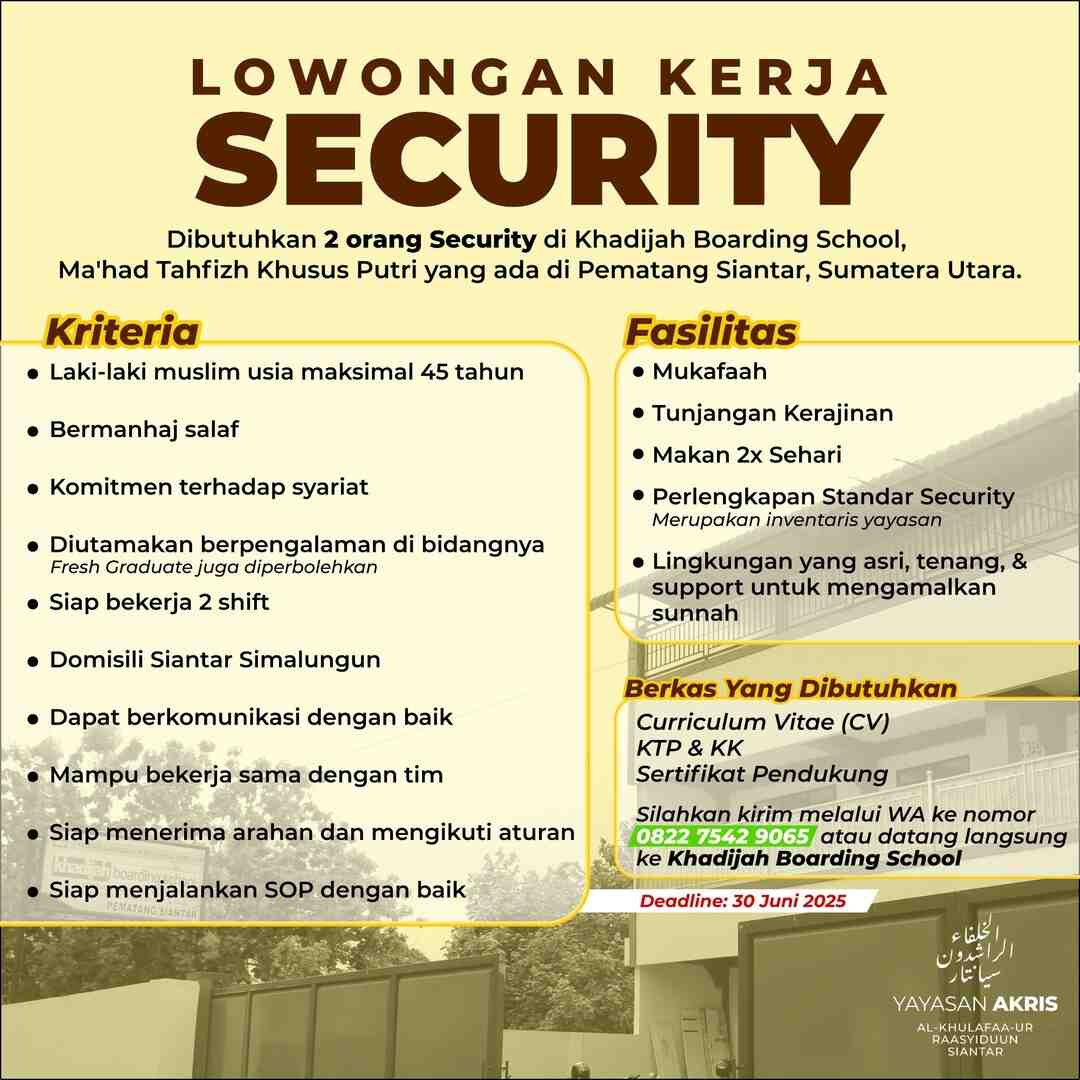 [DIBUTUHKAN] Lowongan Kerja Security (Khadijah Boarding School – Pematang Siantar)
