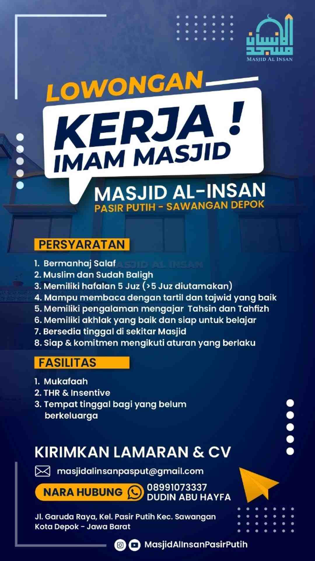 [DIBUKA] Lowongan Kerja – Imam Masjid (Masjid Al-Insan – Depok)