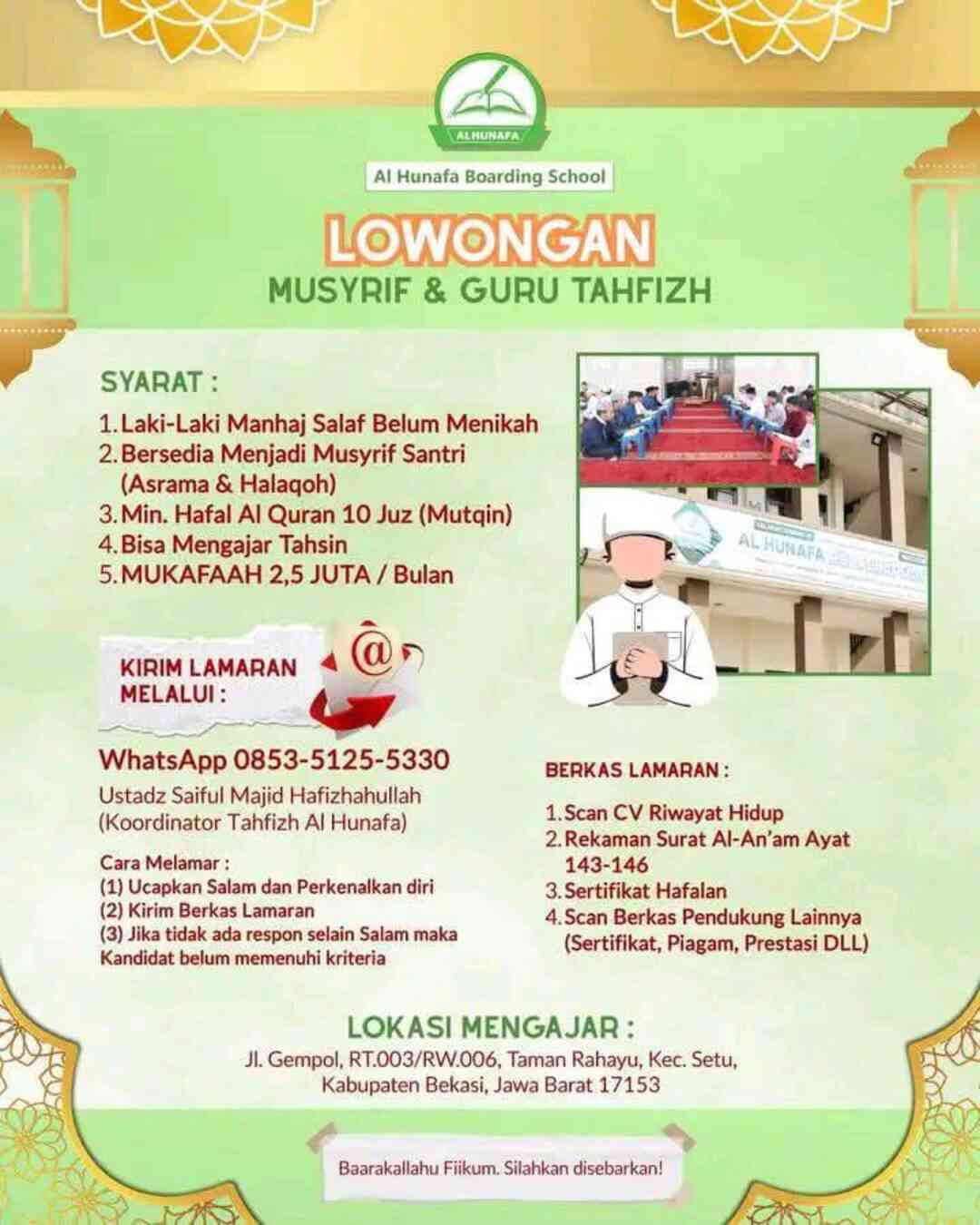[DIBUKA] Lowongan Kerja – Musyrif & Guru Tahfizh (Al Hunafa Boarding School – Bekasi)