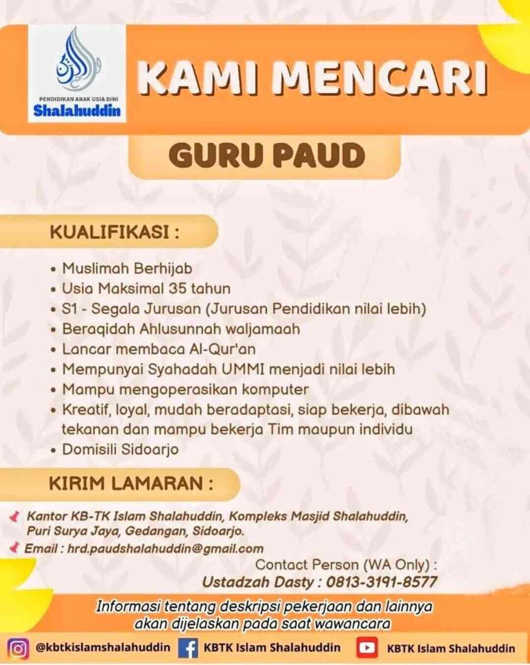 [DICARI] Guru PAUD (KB-TK Islam Shalahuddin – Sidoarjo)