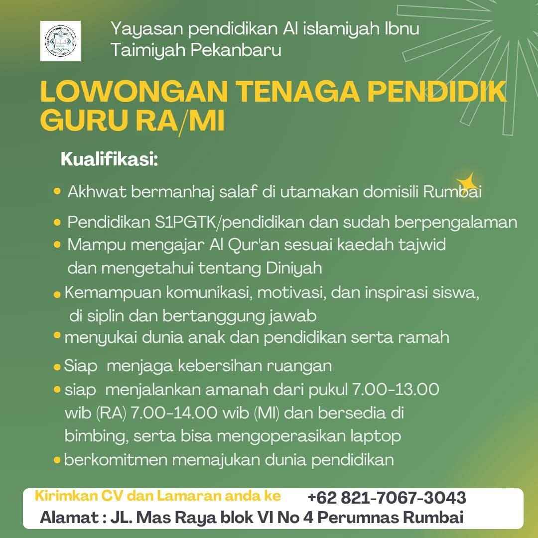[DIBUKA] Lowongan Guru RA/MI (Yayasan Pendidikan Al-Islamiyah Ibnu Taimiyah – Pekanbaru)