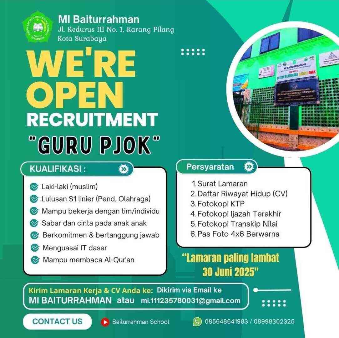 [DIBUKA] Lowongan Kerja – Guru PJOK (MI Baiturrahman – Surabaya)