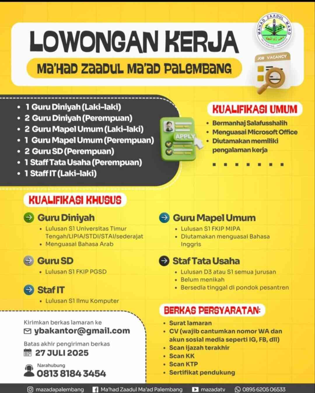 [DIBUKA] Lowongan Kerja Pada 7 Posisi (Ma’had Zaadul Ma’ad – Palembang)