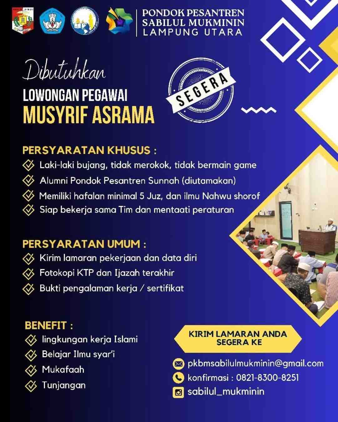 [DIBUTUHKAN] Lowongan – Musyrif Asrama (Pondok Pesantren Sabilul Mukminin – Lampung Utara)