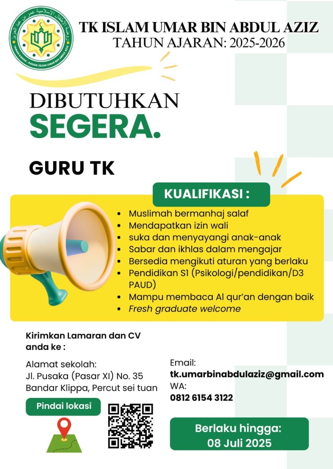[DIBUTUHKAN SEGERA] Guru TK (TK Islam Umar Bin Abdul Aziz – Medan)