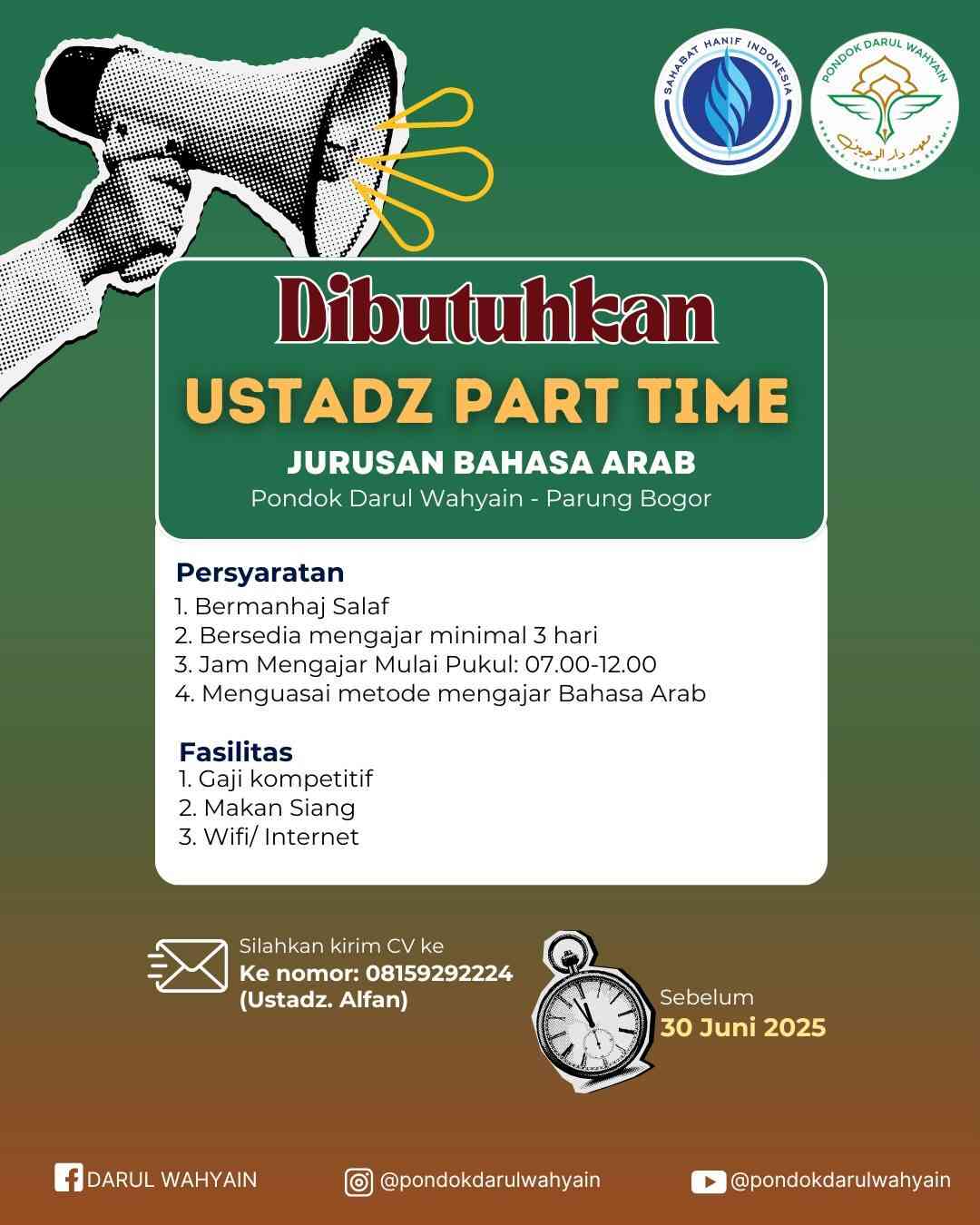 [DIBUTUHKAN] Ustadz Part Time (Bahasa Arab) (Pondok Darul Wahyain – Bogor)