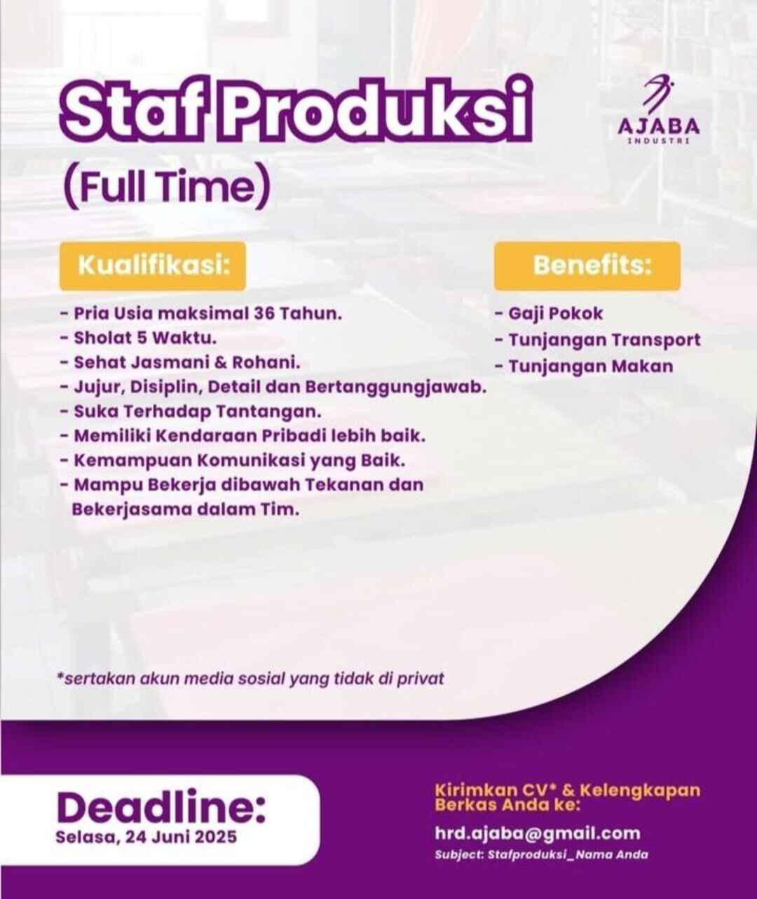 Kirimkan CV & Kelengkapan Berkas Anda Ke Email: hrd.ajaba@gmail.com