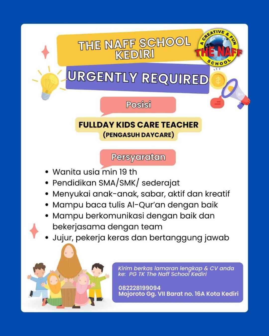 [DIBUTUHKAN] Fullday Kids Care Teacher (Pengasuh Daycare) (The Naff School – Kediri)