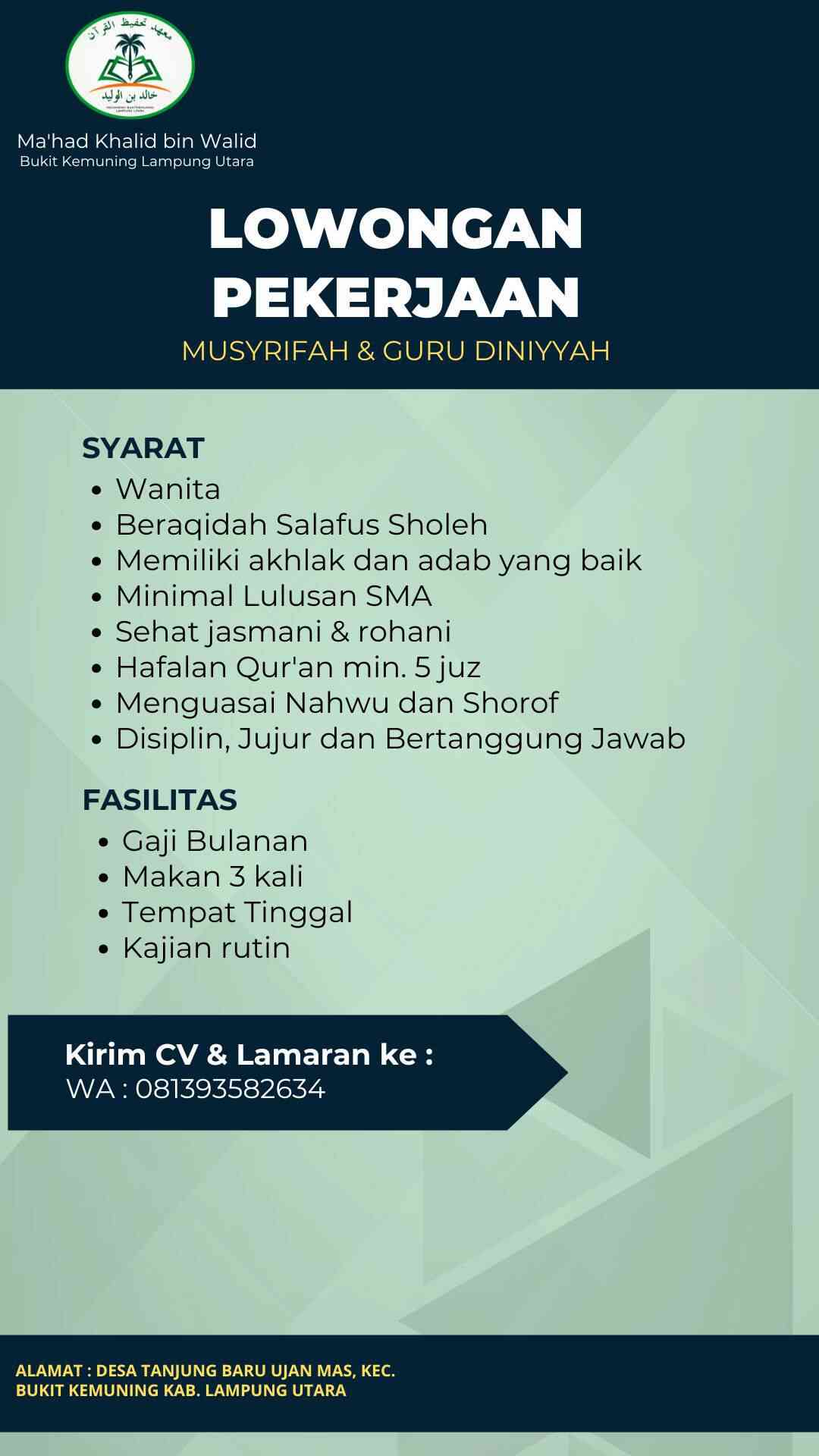 [LOWONGAN PEKERJAAN] Musyrifah & Guru Diniyyah (Ma’had Khalid bin Walid – Lampung Utara)