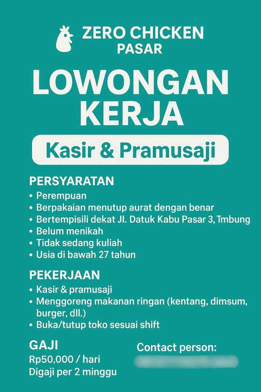 [DIBUKA] Lowongan Kerja Pada 2 Posisi (Zero Chicken – Medan)