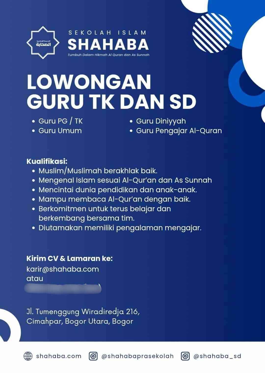 [DIBUKA] Lowongan Kerja Pada 4 Posisi (Sekolah Islam Shahaba – Bogor)