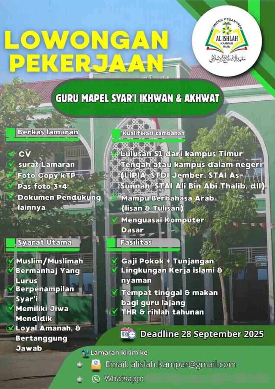 [LOWONGAN PEKERJAAN] Guru Mapel Syar’i Ikhwan & Akhwat (Pondok Pesantren Al-Ishlah – Kab. Kampar, Riau)