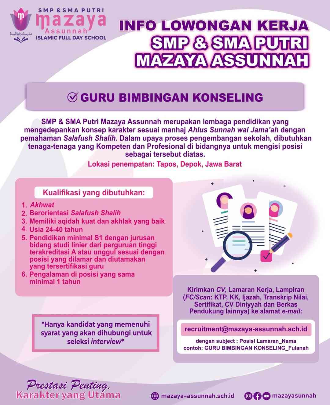 [DIBUKA] Lowongan Kerja – Guru Bimbingan Konseling (SMP & SMA Putri Mazaya Assunnah – Depok)