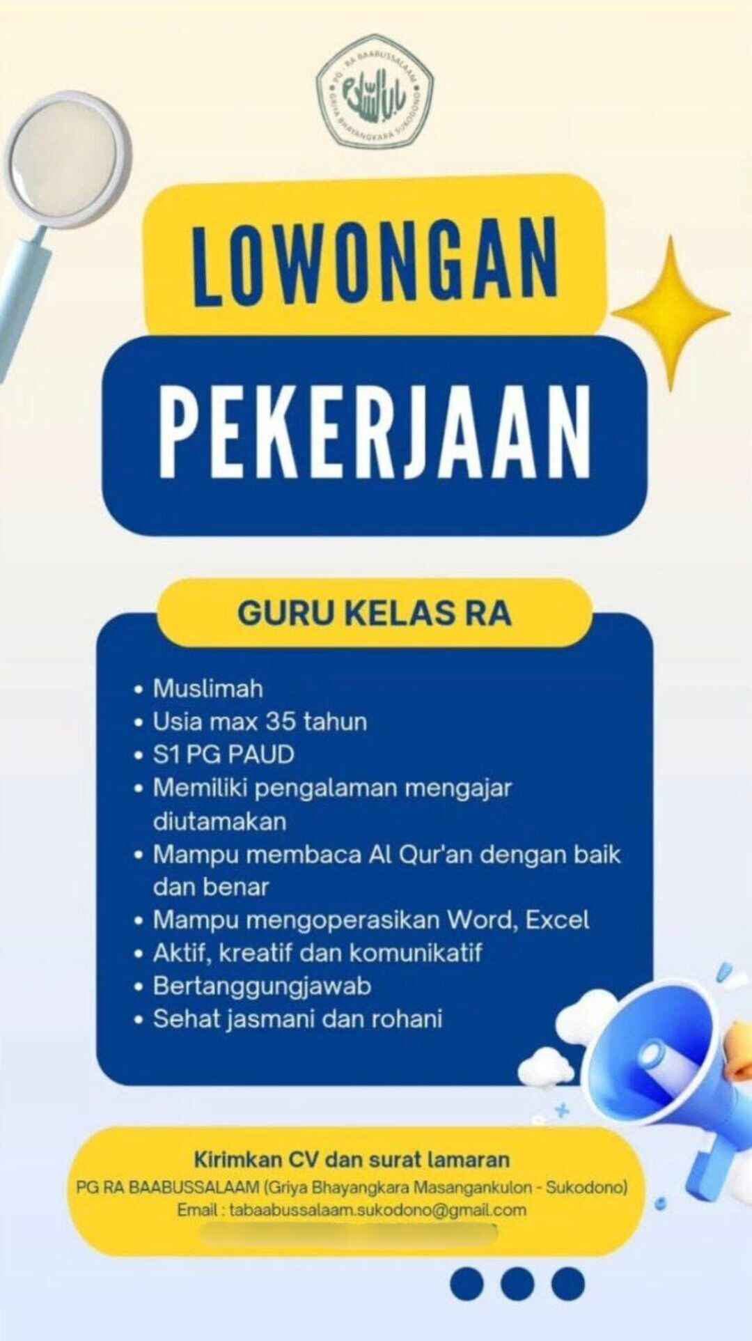 [DIBUKA] Lowongan Pekerjaan – Guru Kelas RA (PG RA Baabussalaam – Sidoarjo)