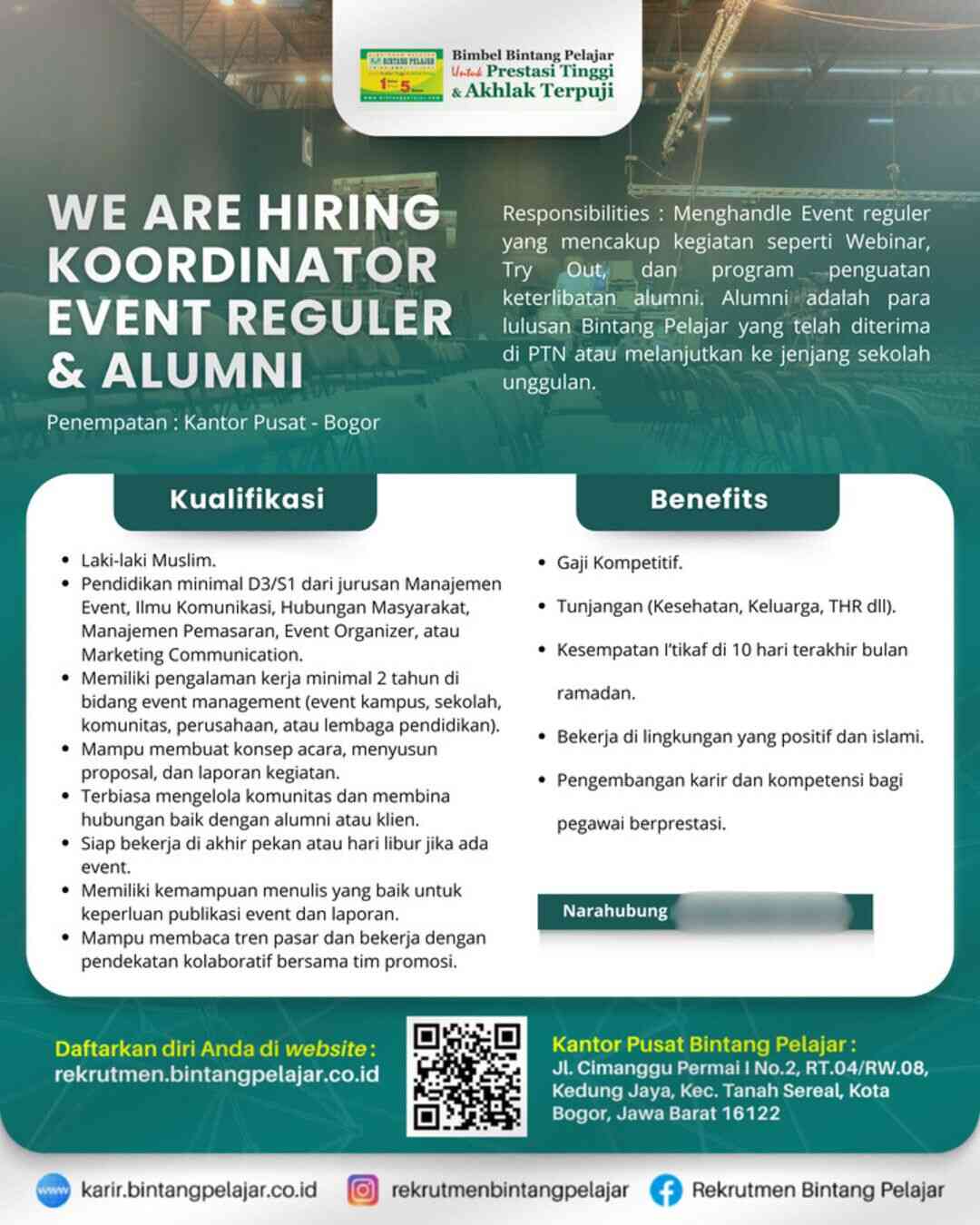 [LOWONGAN PEKERJAAN] Koordinator Event Reguler & Alumni (PT. Bintang Pelajar – Bogor)
