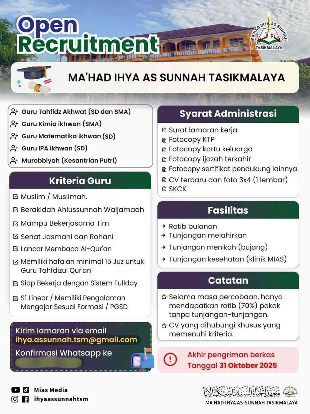 Kirim Lamaran Via Email: ihya.assunnah.tsm@gmail.com