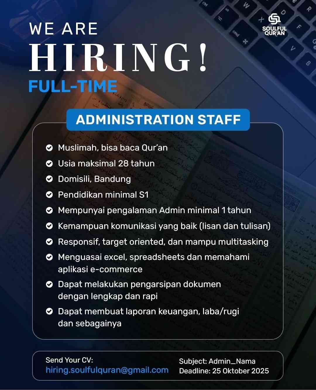 [WE ARE HIRING!] Administration Staff (Full Time) (Soulful Qur’an – Bandung)