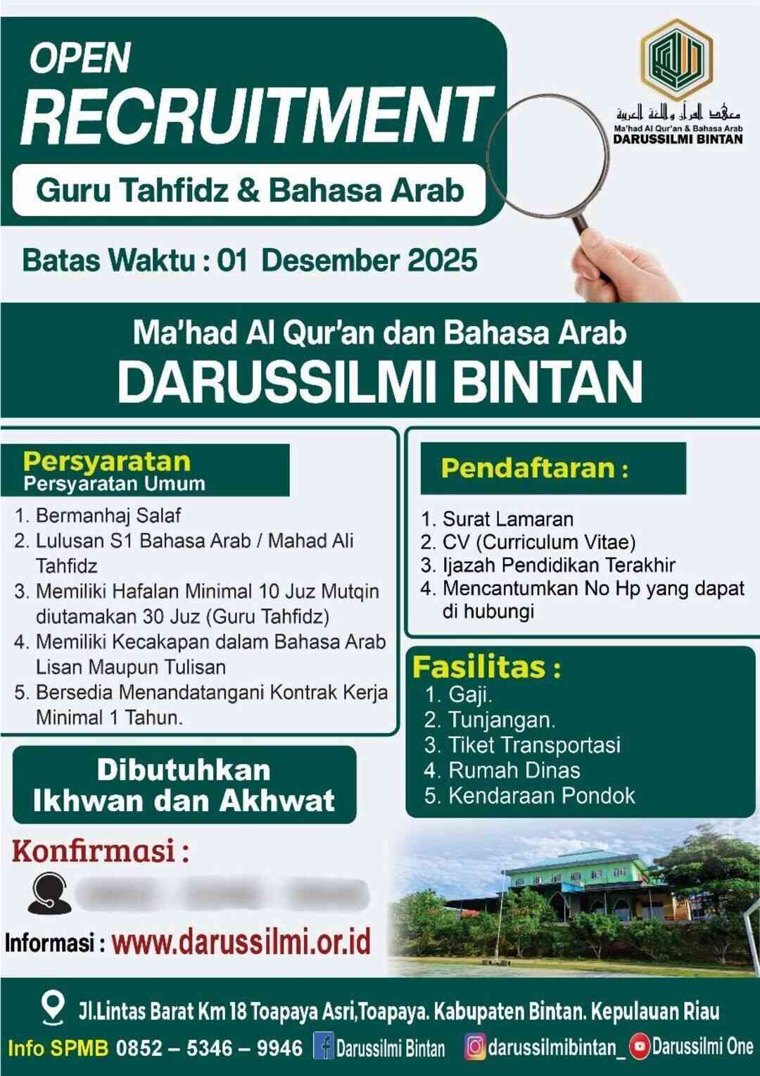 [DIBUKA] Lowongan Kerja Pada 2 Posisi (Ma’had Al-Qur’an dan Bahasa Arab Darussilmi – Kab. Bintan, Kepulauan Riau)