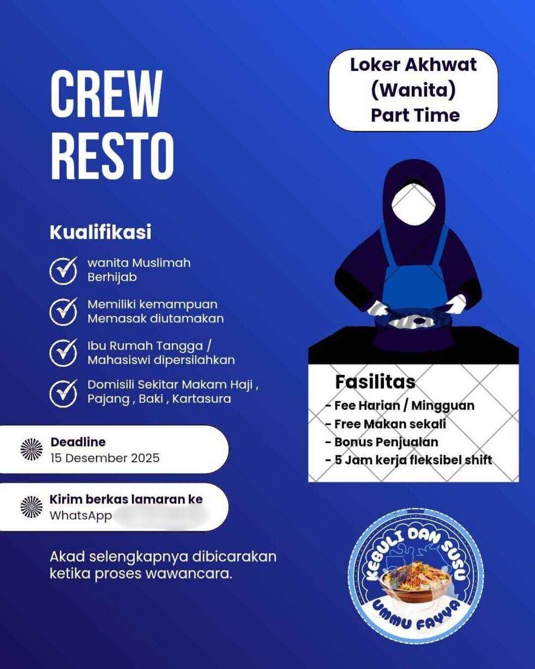 [DIBUKA] Lowongan Kerja – Crew Resto (Part Time) (Nasi Kebuli & Susu Segar Ummu Fayya – Kab. Sukoharjo, Jawa Tengah)