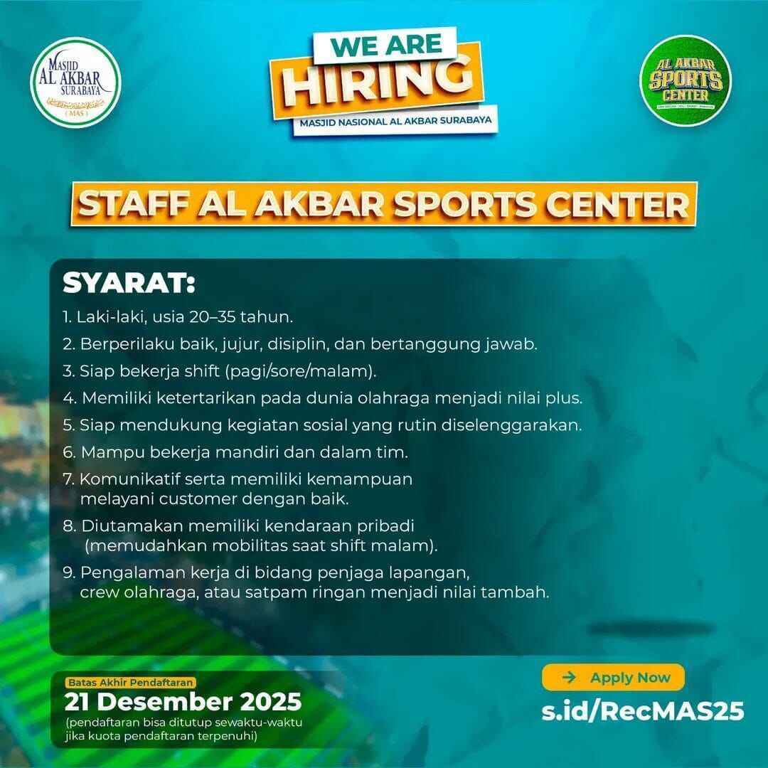 [DIBUKA] Lowongan Kerja – Staff Al Akbar Sports Center (Masjid Nasional Al Akbar – Surabaya)
