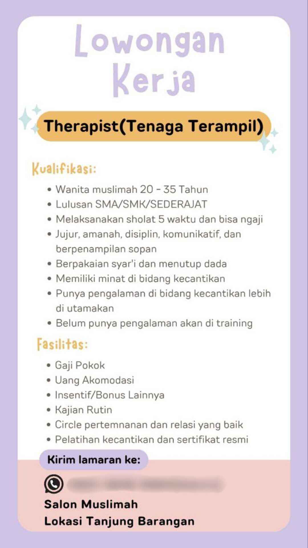 [LOWONGAN KERJA] Therapis (Tenaga Terampil) (Salon Muslimah – Palembang)
