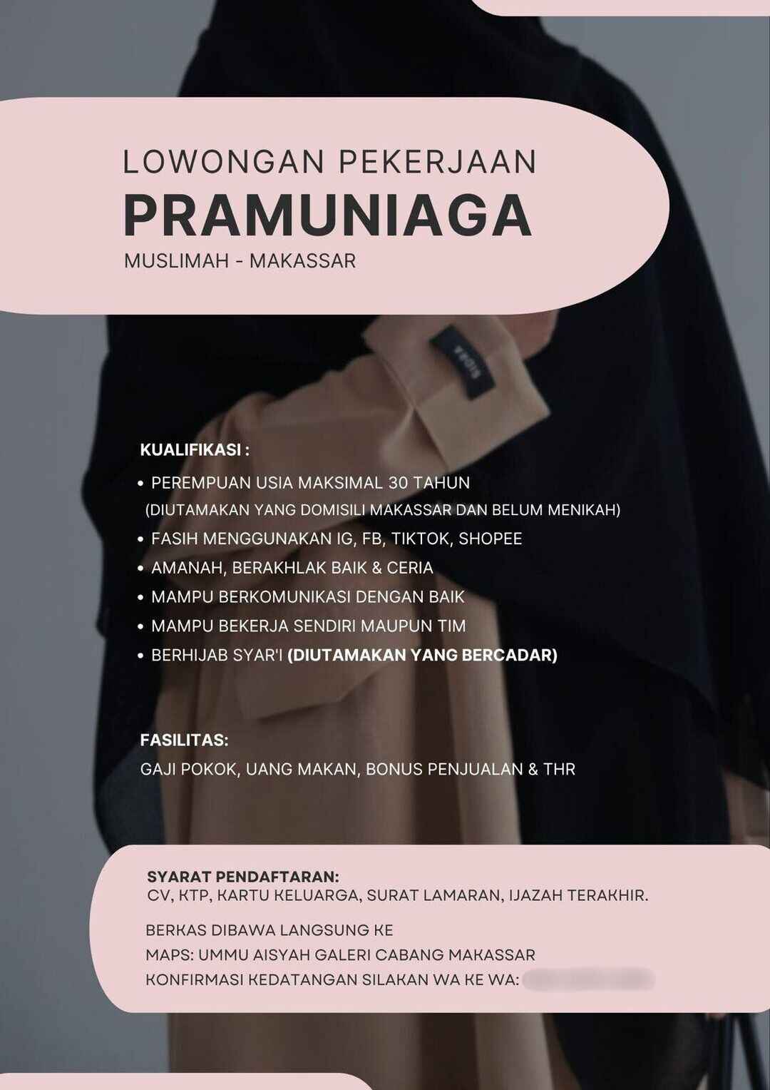 [LOWONGAN PEKERJAAN] Pramuniaga (Ummu Aisyah Galeri – Makassar)