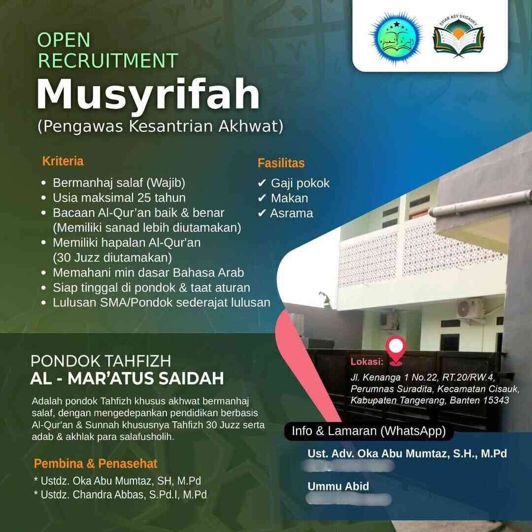 [OPEN RECRUITMENT] Musyrifah (Pengawas Kesantrian Akhwat) (Pondok Tahfizh Al-Mar’atus Saidah – Tangerang)