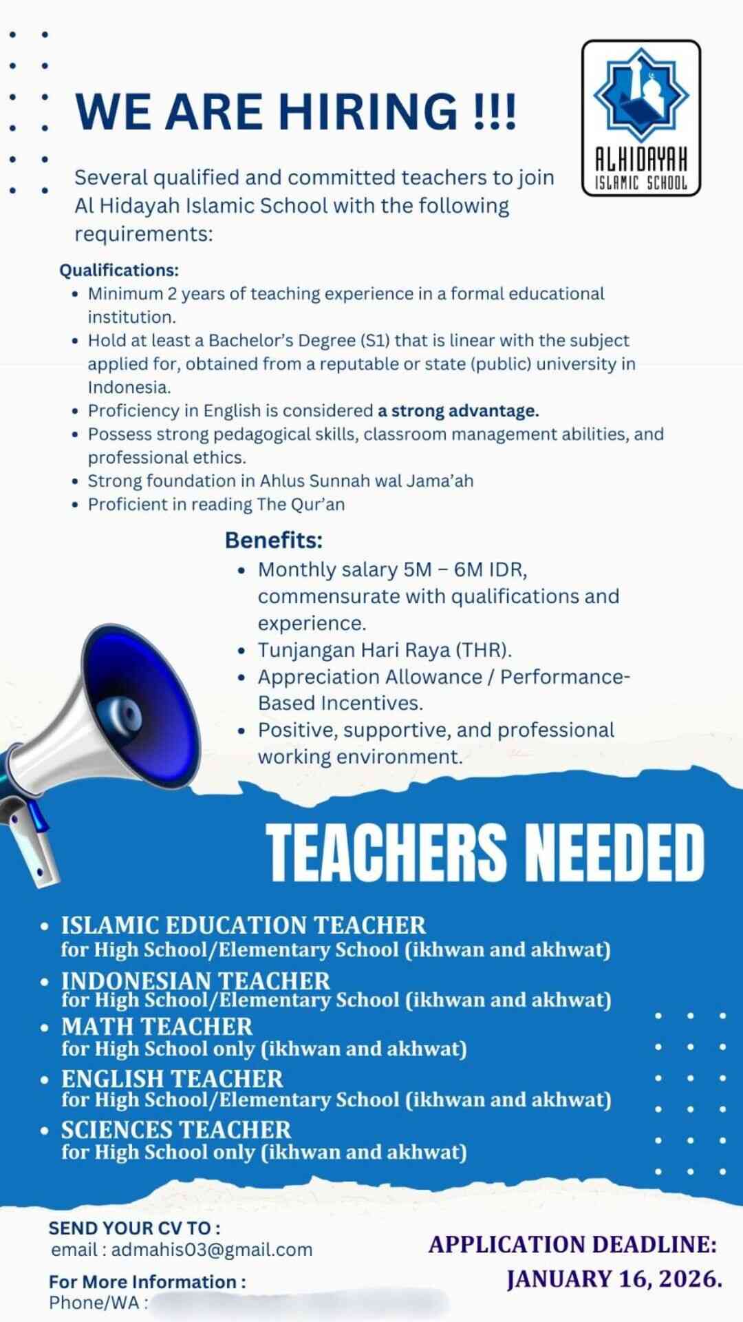 Al Hidayah Islamic School membuka kesempatan bagi para guru profesional, berdedikasi, dan berakhlak Islami untuk bergabung dan bertumbuh bersama kami dalam lingkungan pendidikan Islam yang positif dan suportif.