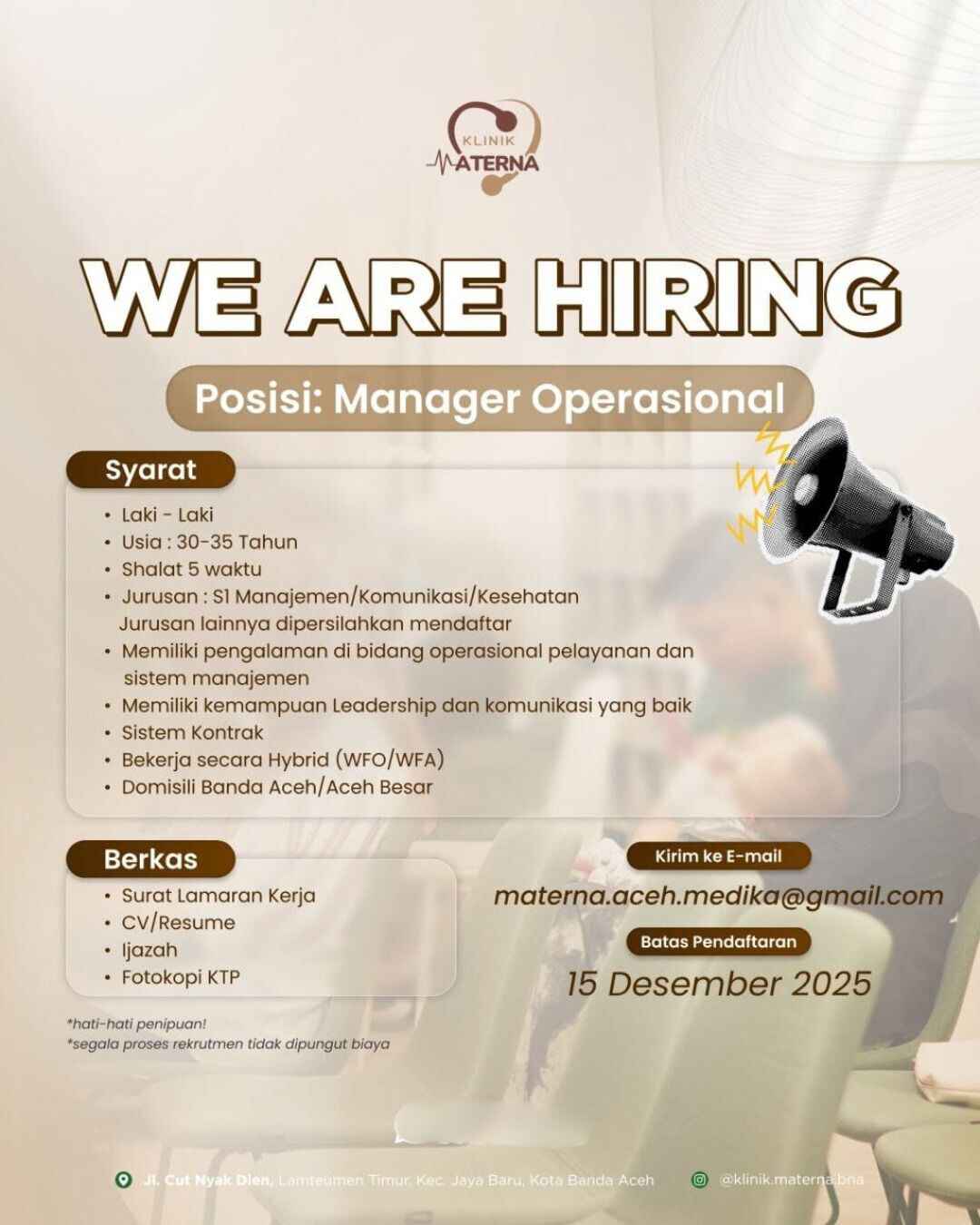 [WE ARE HIRING] Manager Operasional (Klinik Materna – Banda Aceh)