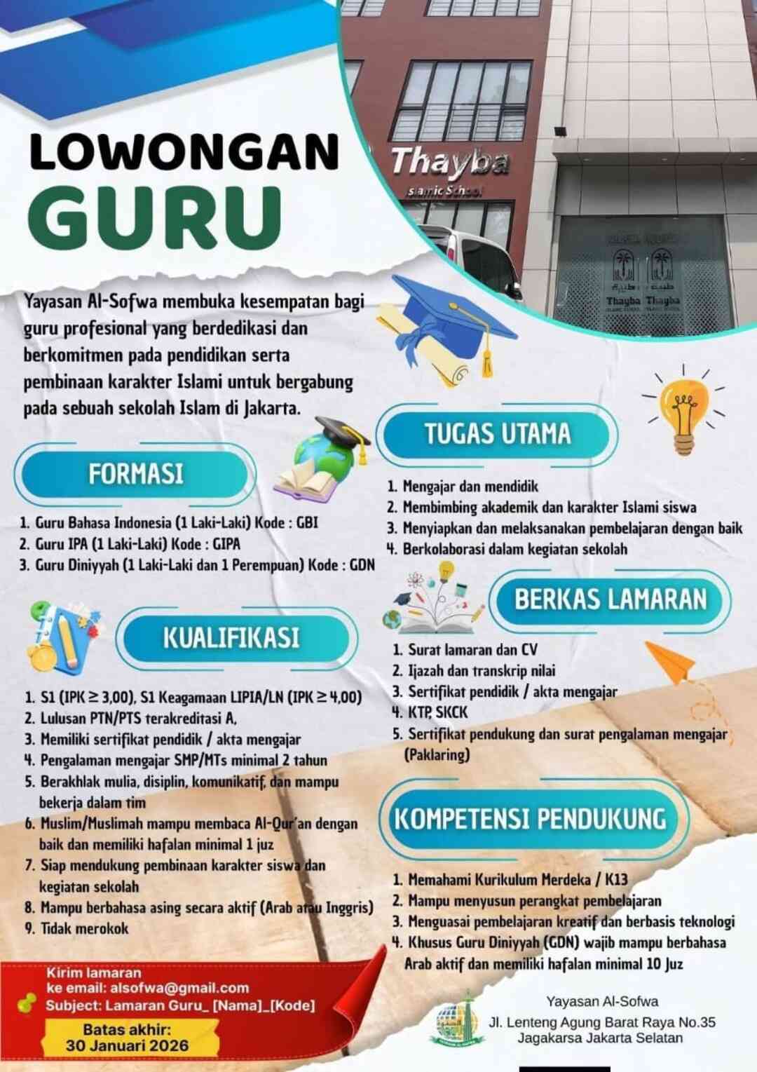 Yayasan Al-Sofwa membuka kesempatan bagi guru profesional yang berdedikasi dan berkomitmen pada pendidikan serta pembinaan karakter Islami untuk bergabung pada sebuah sekolah Islam di Jakarta.
