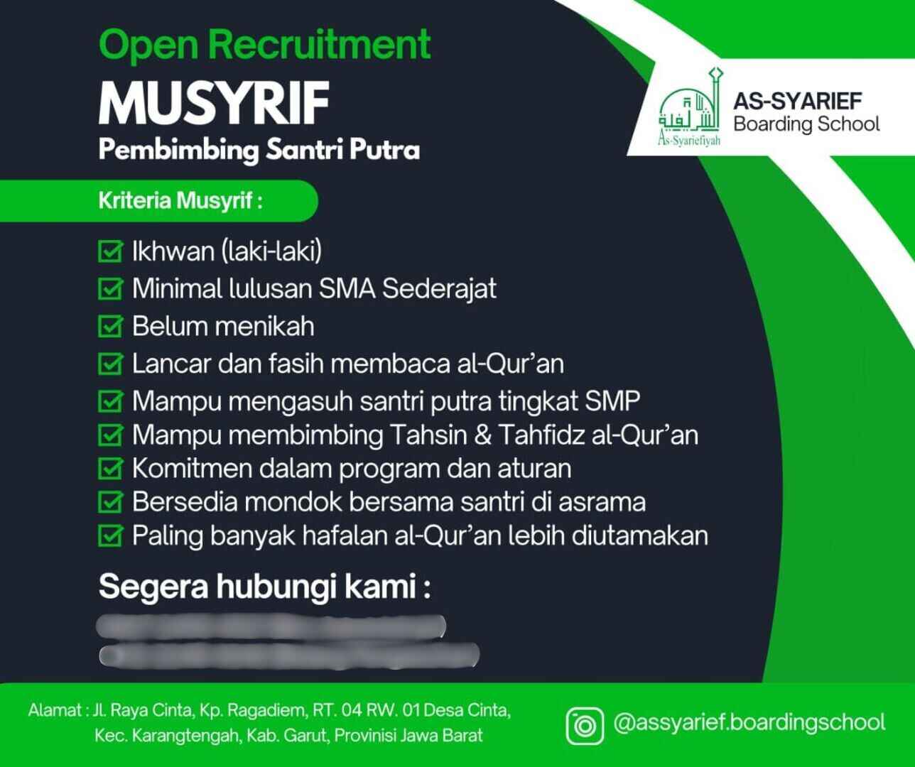 [OPEN RECRUITMENT] Musyrif (Pembimbing Santri Putra) (As-Syarief Boarding School – Kab. Garut)